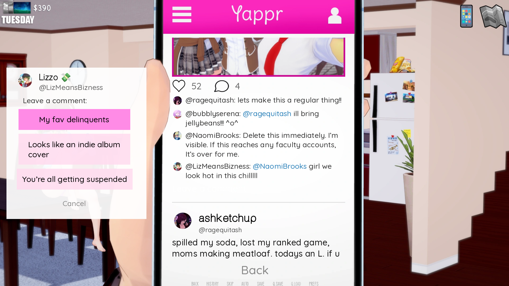 A fully interactable in-game feed where characters post, comment, and sometimes overshare. You can scroll, click, and even unlock hidden scenes through certain posts. -